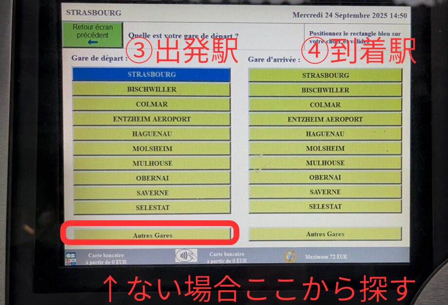 表示画面に駅名がない場合は、下の赤枠(Autres Gares)を押して探します