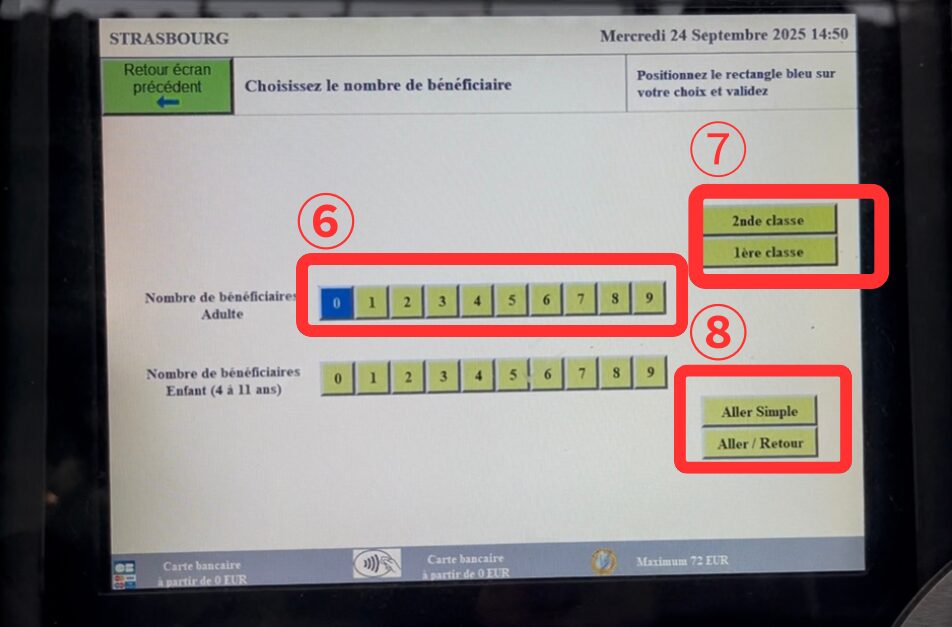 ⑧上はAller Simple(片道切符)、下は(Aller/Retour→往復切符)